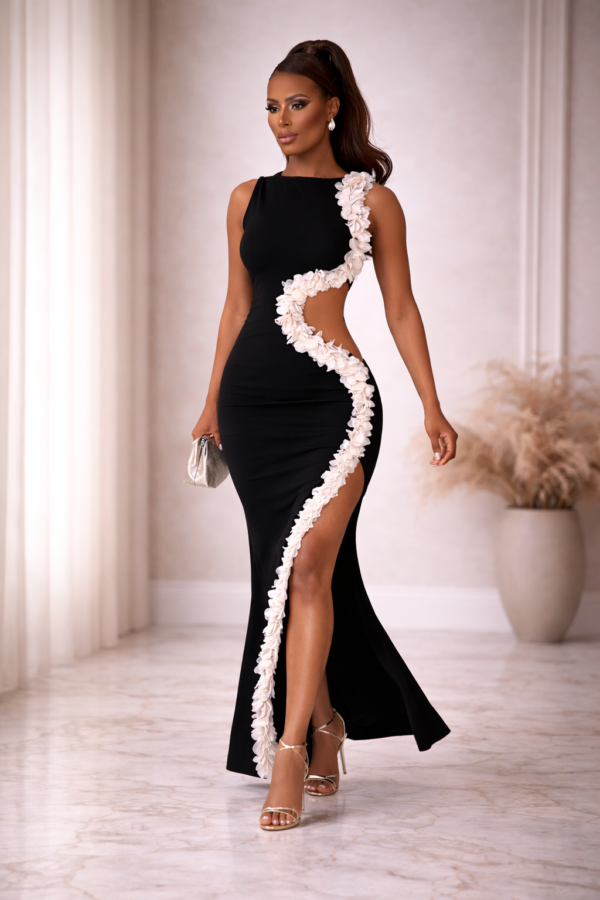 El maxi floral de línea S is a refined expression of sophistication, designed for the woman who embraces modern femininity with absolute confidence. This black cut-out floral appliqué dress is crafted in a sleek, fitted silhouette that features a sculpted side cut-out enhanced with cascading white floral details. The asymmetric design creates a bold contrast, balancing the architectural structure of the high round neckline with the soft, romantic touch of the appliqué. Featuring a high slit for graceful movement, it is the ultimate choice for luxury birthdays, gala evenings, and high-profile celebrations.