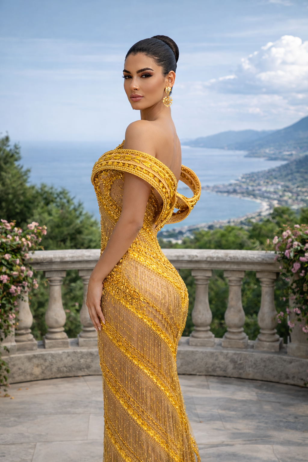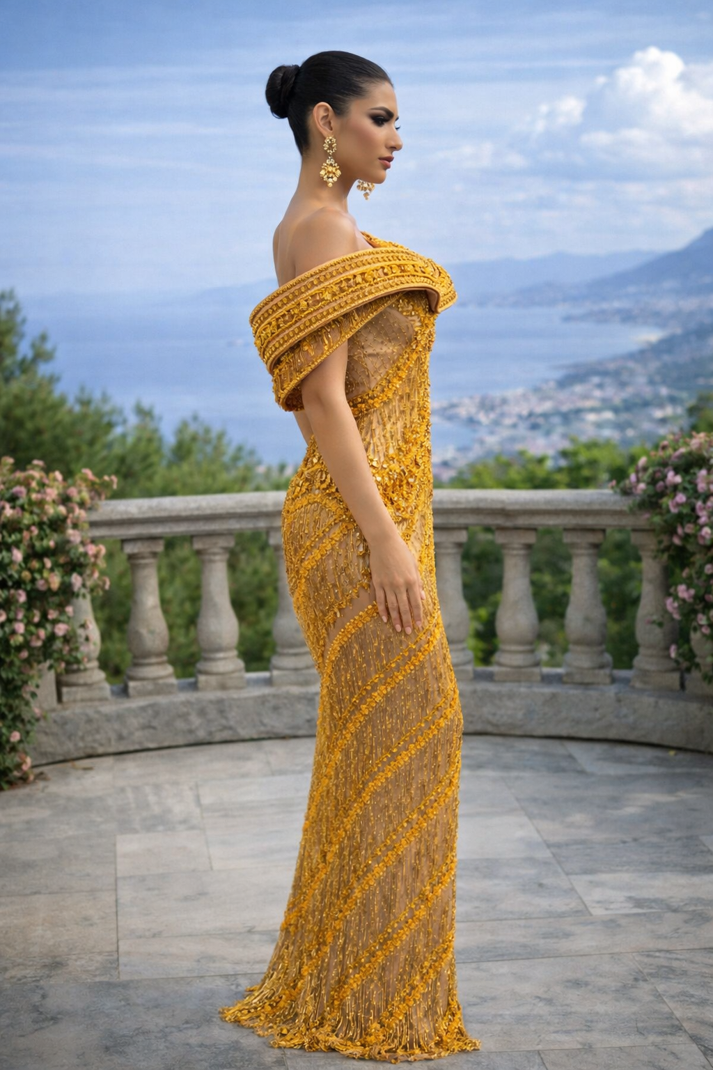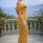 The architectural heart of L'abito con frange architettoniche The Golden Meridian is its unique, circular structured halo frame. This gravity-defying off-shoulder neckline creates a dramatic, ethereal frame around the shoulders and collarbone, elevating the garment from a dress to a piece of wearable art. This “Imperial Aurelia” design uses internal reinforcement to maintain its crisp, circular shape without compromising the wearer’s ability to move. By framing the face and shoulders with such geometric precision, the gown provides a regal, statuesque presence that is unmatched by traditional evening silhouettes.
