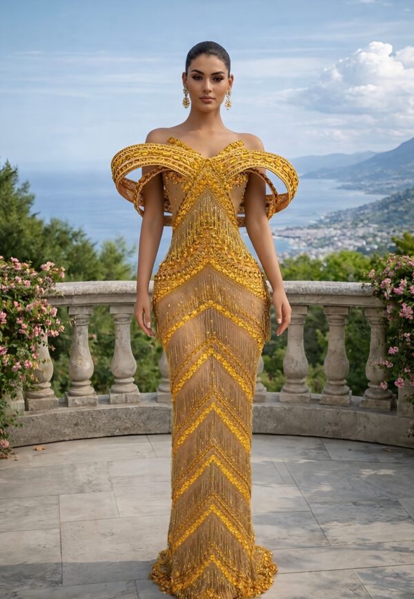 What brings L'abito con frange architettoniche The Golden Meridian to life is the meticulously hand-placed metallic fringe. Arranged in a sophisticated downward chevron pattern, the fringe serves a dual purpose: it visually elongates the silhouette, creating an illusion of infinite height, and it provides mesmerizing kinetic movement. With every step, the gold fringe sways and shimmers, creating a rhythmic “sweep” that mimics the flow of liquid gold. This chevron beadwork is reinforced at the base to ensure durability while maintaining a lightweight feel, allowing the fringe to dance as you navigate galas, award ceremonies, and editorial appearances.