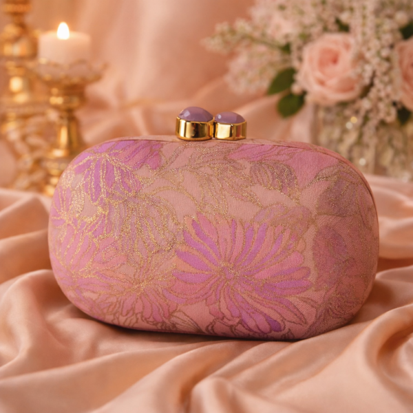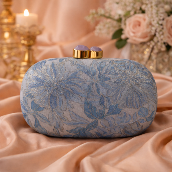 Elegant oval clutch with intricate floral detailing and a structured hard-shell design. Finished with a polished metallic clasp and soft cotton lining, it’s the perfect statement piece for weddings, dinners, and special occasions.