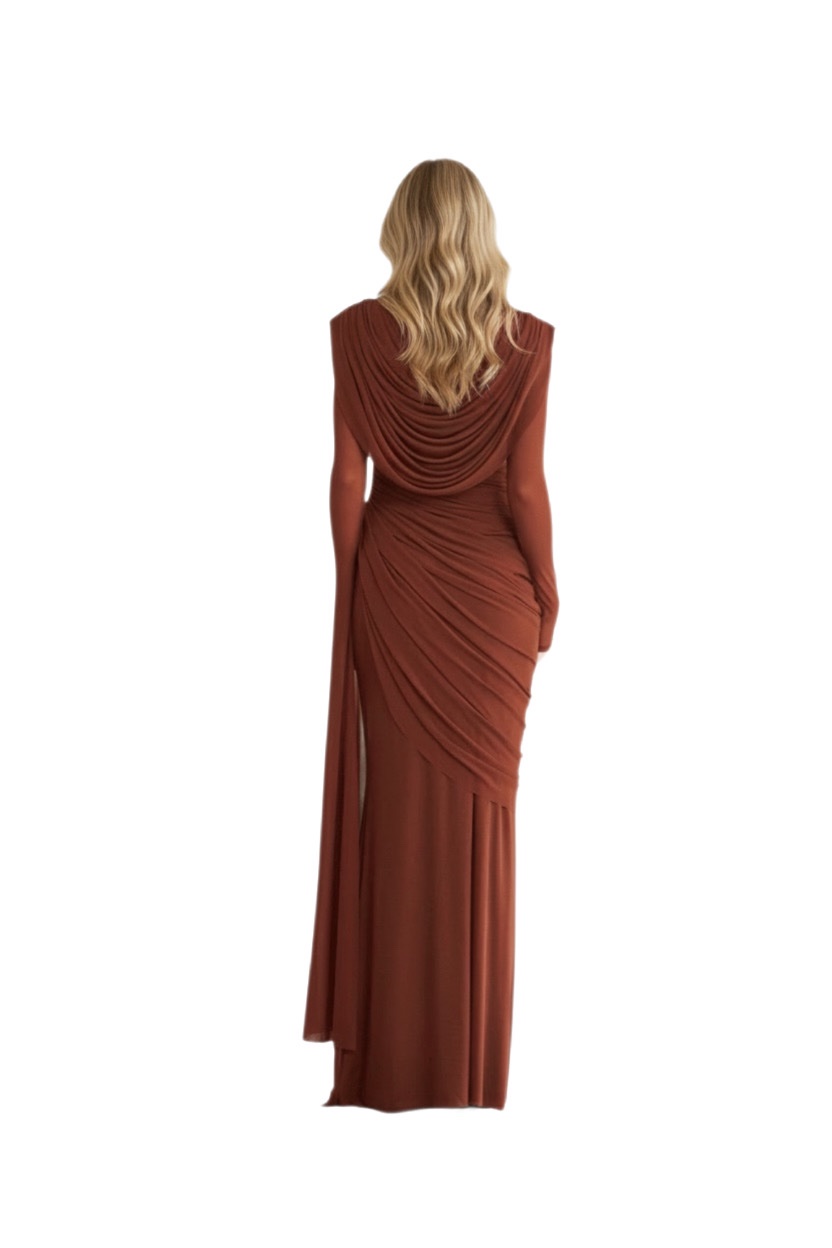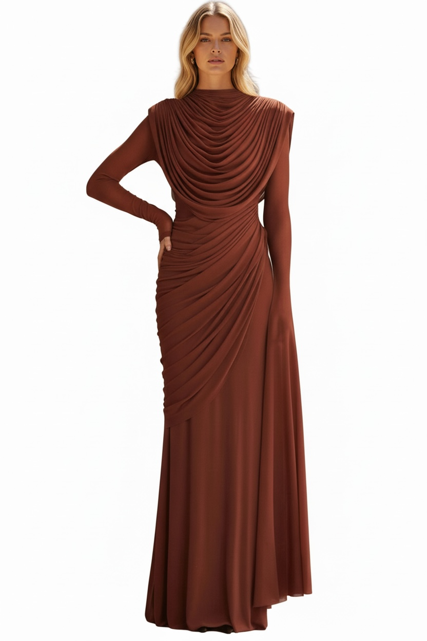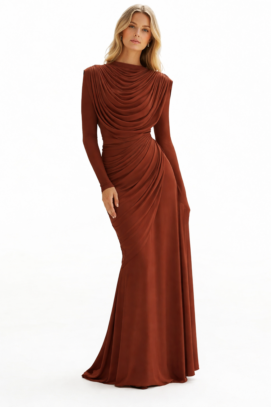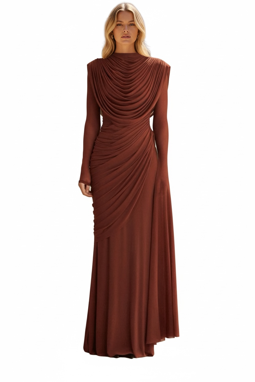 A masterclass in minimalist draping, The Amberley Draped Maxi Dress is designed for the modern woman who commands the room. Featuring a dramatic cowl-neck overlay and extra-long sleeves, this “one-step” gown provides a statuesque silhouette with the comfort of a soft stretch blend.The rich, warm tone offers a “liquid” movement effect that balances high-coverage elegance with bold, editorial design. Perfectly suited for autumn galas, elite dinners, and formal evening celebrations.