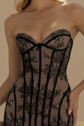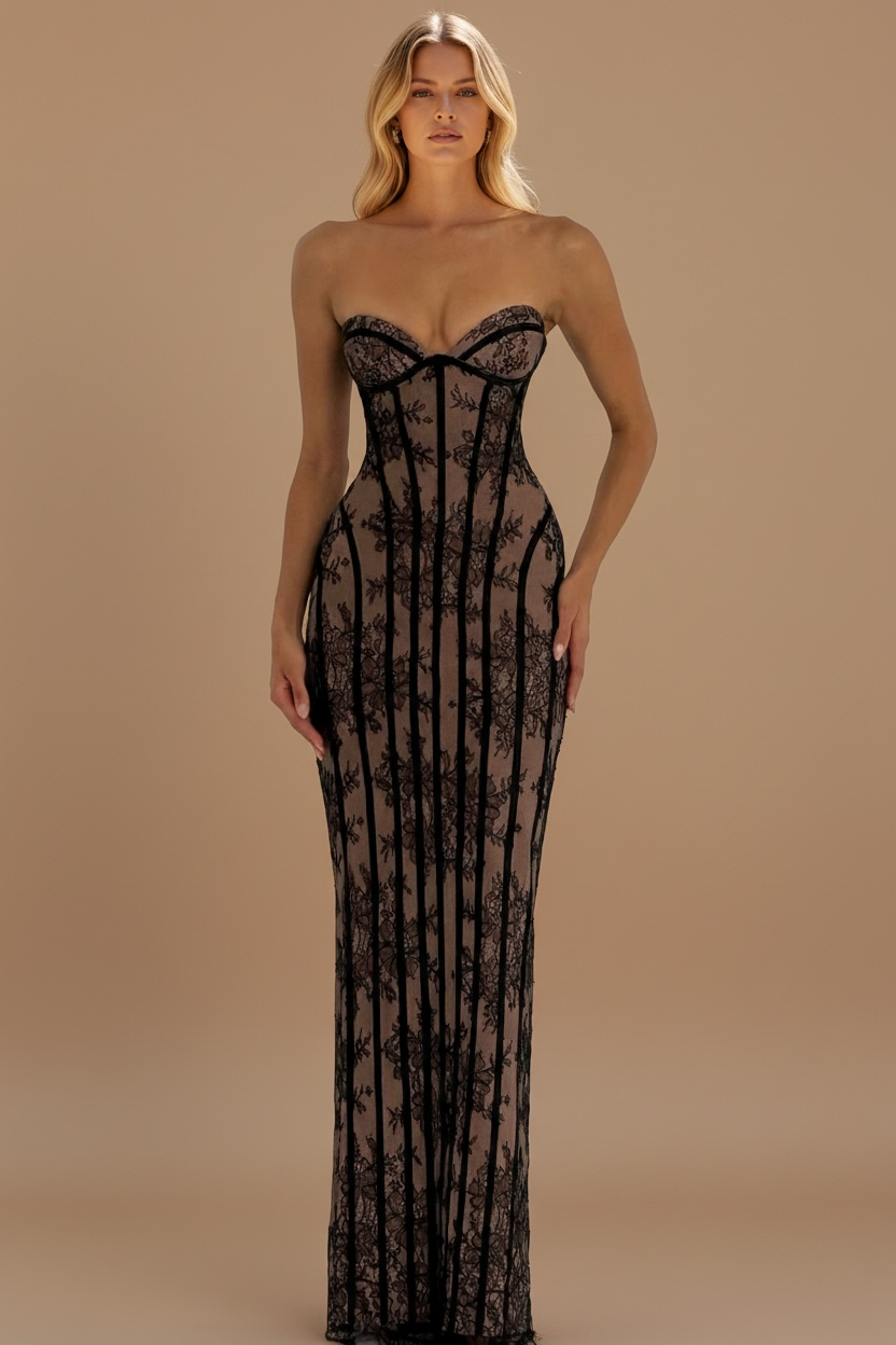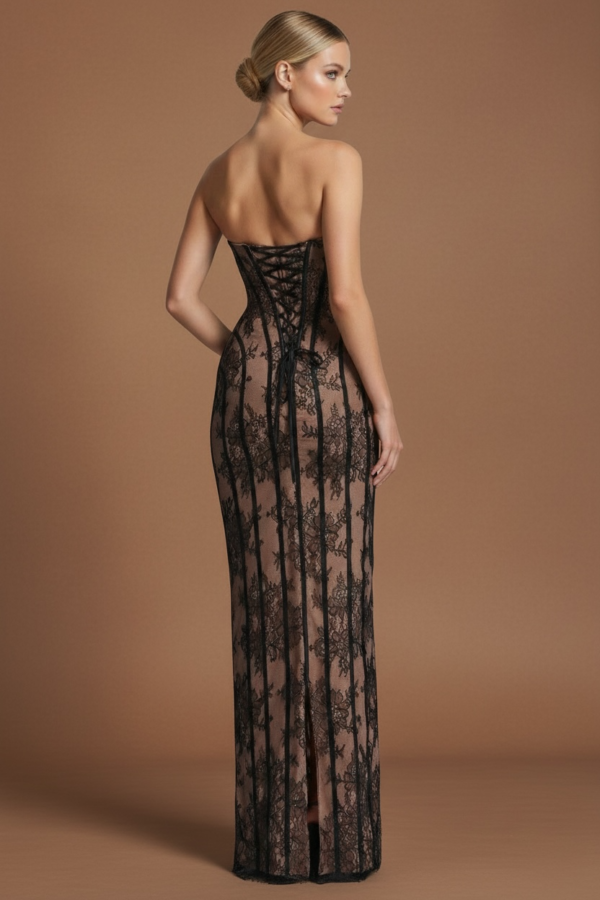 A masterclass in structural elegance, The Obsidian Lace Gown is designed for the woman who commands the room with an editorial edge. Featuring a precision-boned corset waist and a dramatic nude illusion lace overlay, this gown provides a statuesque mermaid silhouette with the allure of luxury contrast.The intricate floral embroidery and strapless sweetheart neckline offer a “liquid” movement effect that balances high-coverage elegance with bold, modern design. Perfectly suited for evening galas, formal weddings, and high-end birthday celebrations.