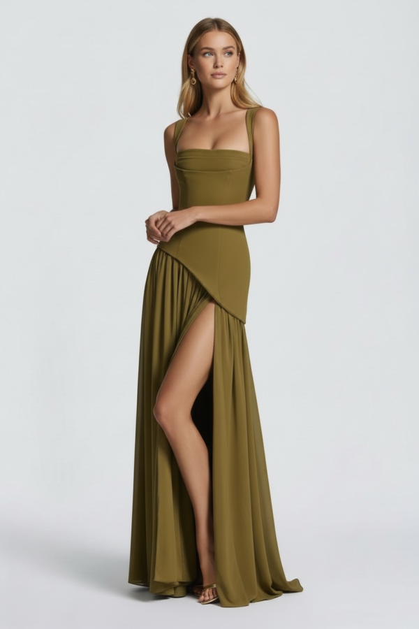 The premium polyester blend offers a medium-weight feel that ensures the dress maintains its statuesque sheath silhouette through hours of movement. Featuring a subtle stretch for enhanced mobility, this piece balances a regal presence with the comfort required for elite social calendars. For a polished, high-fashion aesthetic, pairing this gown with the sleek luster of our Premium Human Hair Collection allows the earthy olive tones to radiate with maximum impact.
