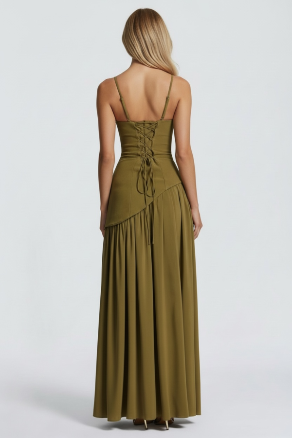 The defining characteristic of The Olive Asymmetric Midi Dress is its intricate, draped hemline. This design ensures a multidimensional visual effect, where the diagonal lines elongate the frame while providing a weighted, high-quality drape.