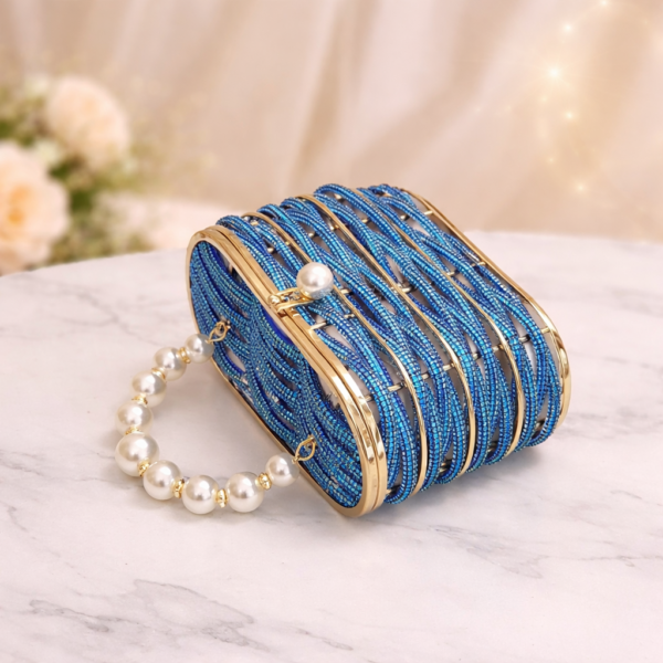 The defining feature of the Azure Pearl Crystal Frame Clutch is its detailed blue crystal beadwork. Each crystal is carefully arranged to create a dimensional surface that reflects light from every angle. The rich azure tone offers depth and vibrancy, while the polished gold-tone frame provides structure and durability.