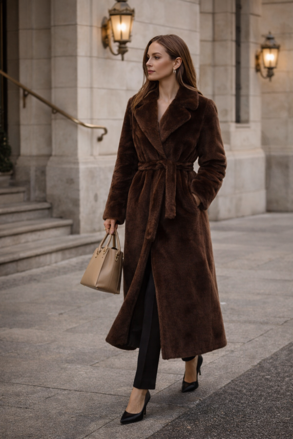 For evening wear, drape the coat over a sleek dress to add drama and elegance. The maxi length enhances movement, creating a flowing silhouette that feels both powerful and graceful.