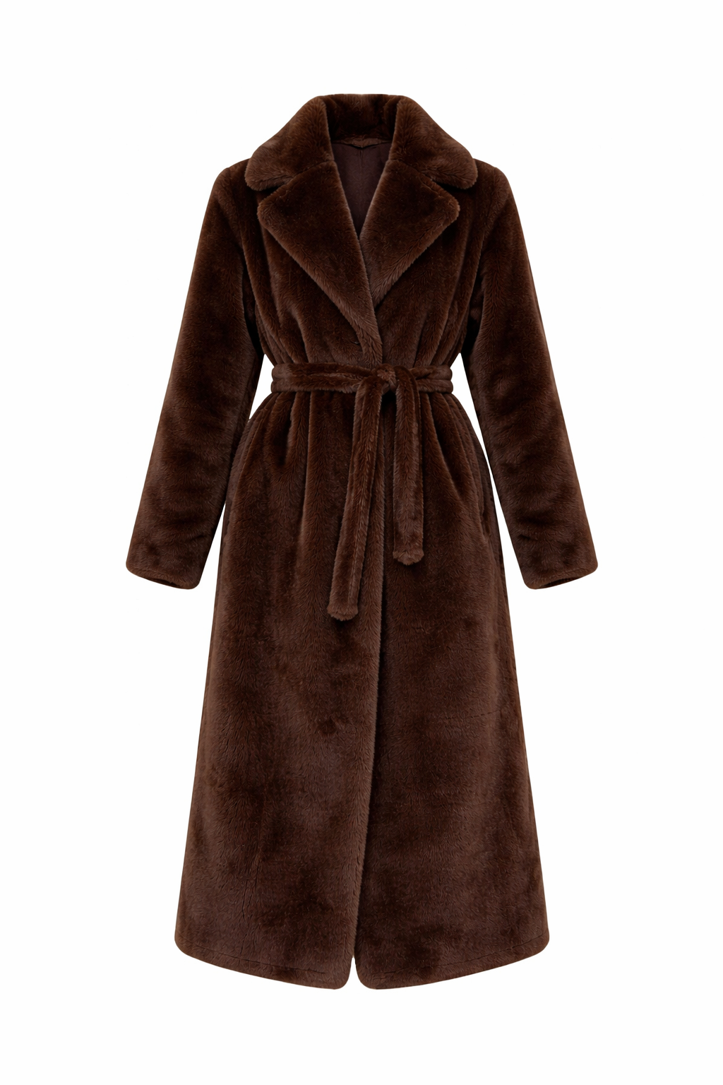 A luxurious Tailored Maxi Wool Coat in Chocolate Brown, crafted from premium wool with a structured collar and detachable waist belt. Available in S, M, and L — perfect for stylish warmth in colder seasons.