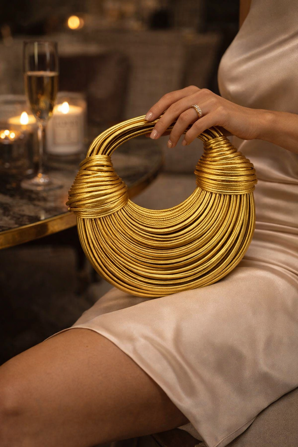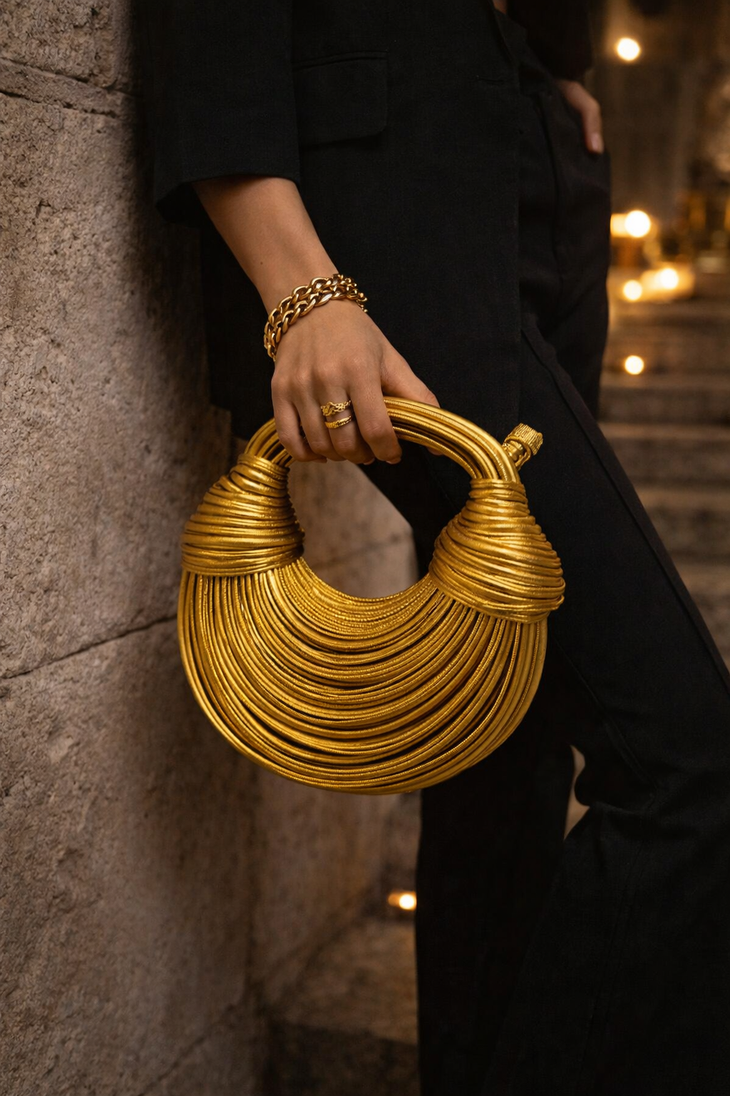 This bag is the “hero” of any ensemble. To maximize its impact, we recommend pairing the Aureon Sculptural Gold Bag with minimalist evening wear. A floor-length velvet gown in emerald green or a sleek navy silk slip dress will allow the gold metallic coils to pop beautifully. For a modern, high-fashion look, pair it with a crisp white tailored suit. Whether you are attending a wedding or a luxury brand event, this bag signals a commitment to architectural elegance.