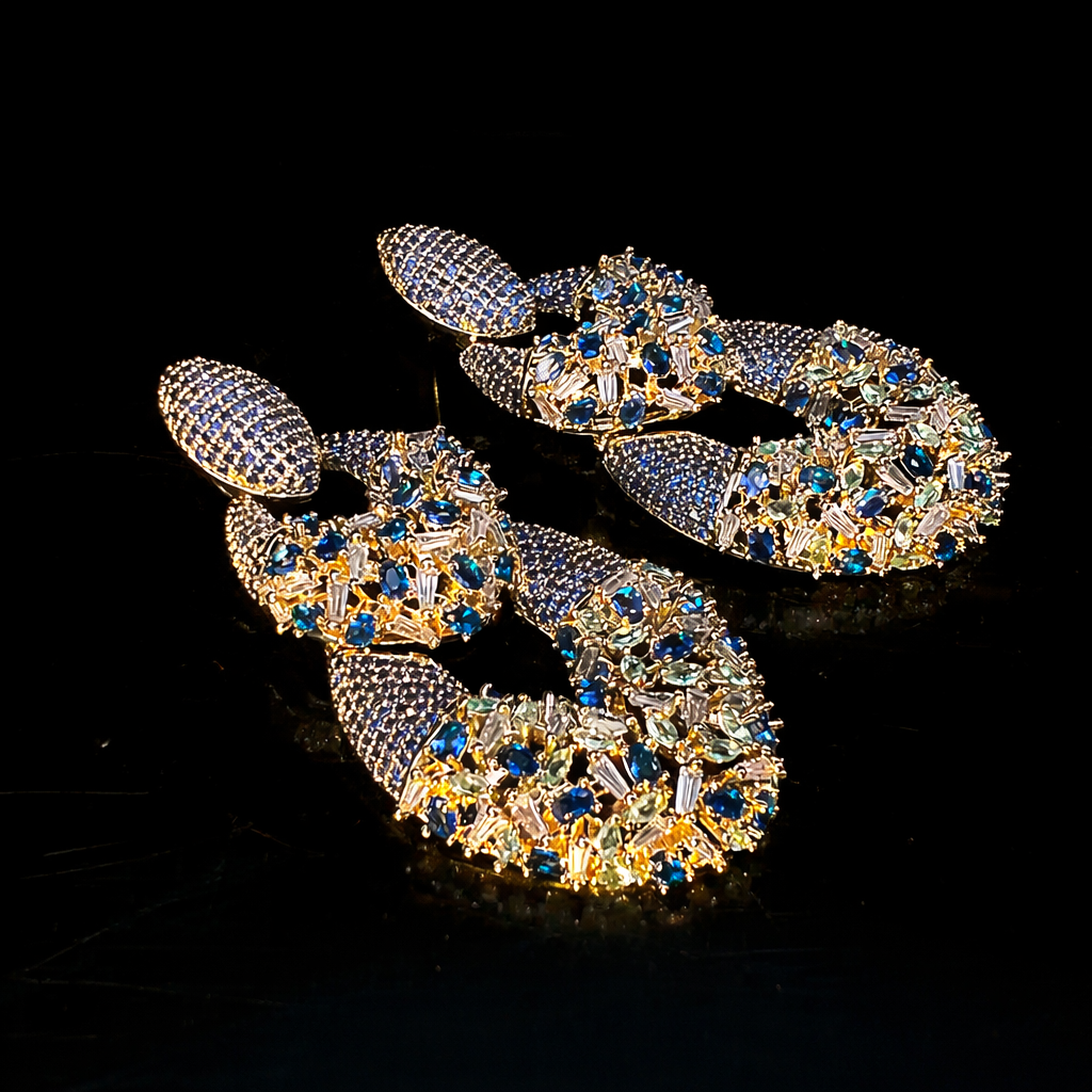 Crafted in copper with high-quality gold-tone electroplating, the finish enhances the depth of the sapphire-inspired hues while maintaining a polished, luxurious appearance. The sculptural composition creates graceful movement, making them ideal for evening occasions, weddings, formal events, or elevated everyday styling.