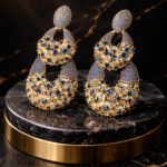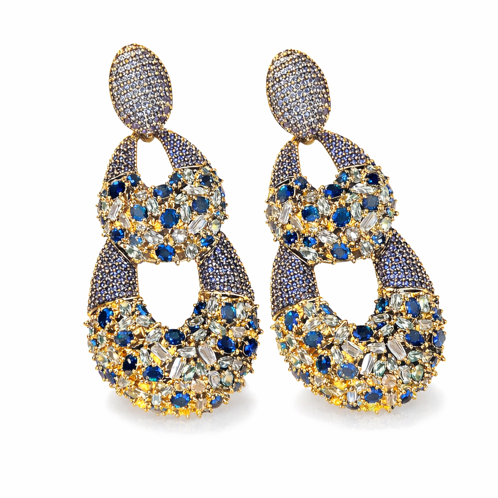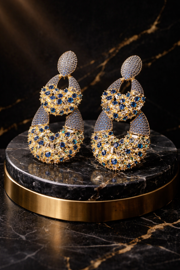 The Azure Dynasty Drop Earrings blend modern structure with timeless elegance. Designed with layered oval and crescent silhouettes, these earrings are adorned with rich blue stones and luminous crystal accents that reflect light beautifully.