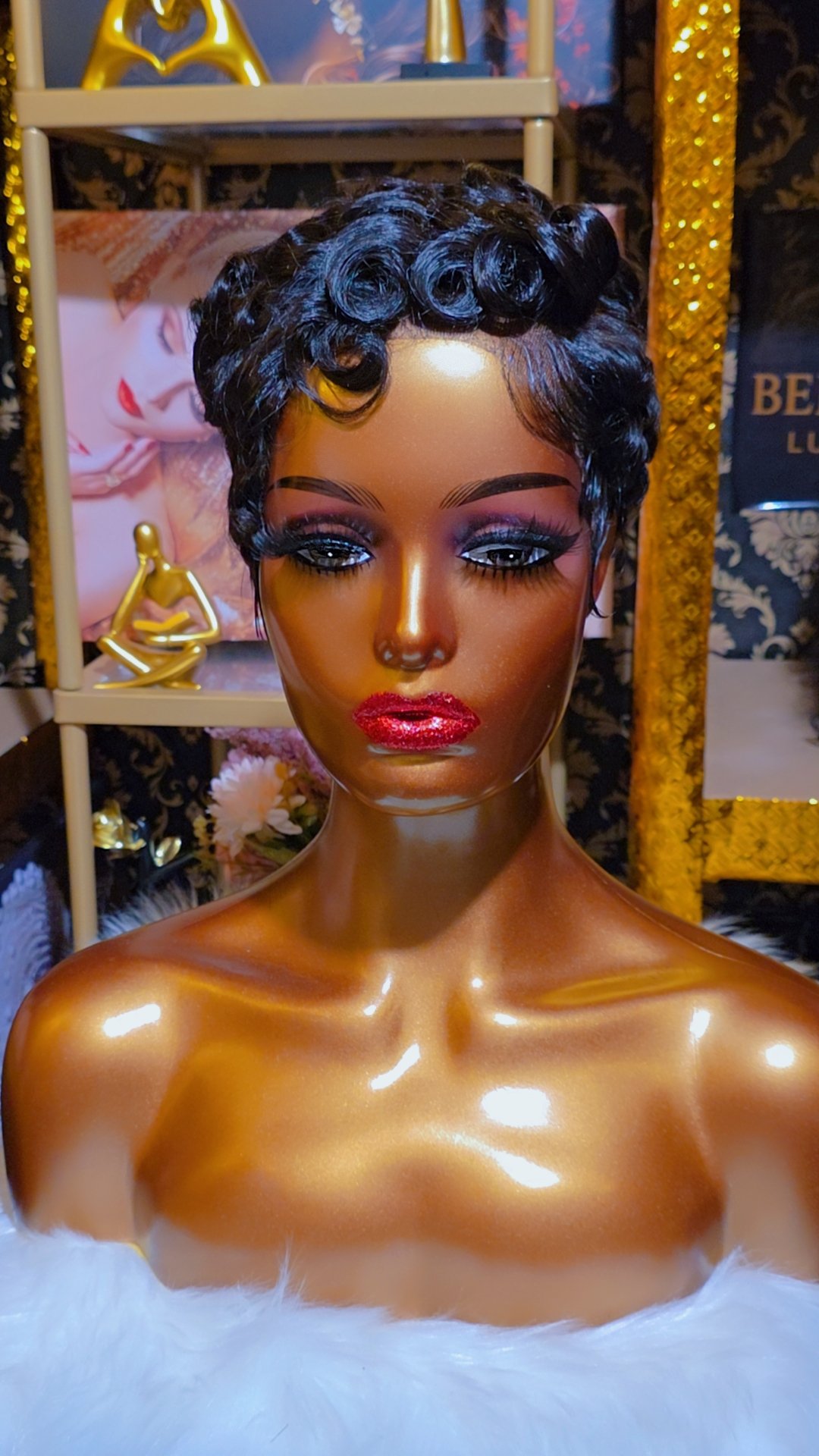 Made from premium human hair, the Naomi Pixie Wig offers a smooth, natural feel with a soft luminous shine. The curled texture reflects light gently, giving the deep black tone a rich and luxurious finish.
